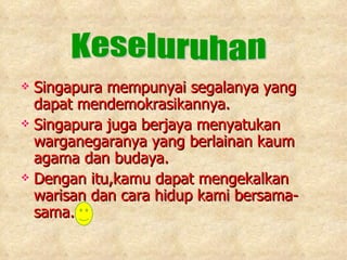Negara kita juga dikenali sebagai sebuah negara yang multikultural multi-culture di mana sifat-sifat kemajmukannya dalam konteks kemasyarakatan yang luas juga. Kajian pengkaji adalah mencakupi Dasar Kebudayaan Kebangsaan yang memenuhi objektif pengukuhkan perpaduan melalui kebudayaan memelihara keperibadian kebangsaan dan peningkatkan kualiti hidup kehidupan. Peluang memahami budayacara hidup kaum walaupun berlainan kaum lain -tiada perasaan hasad dengki dendam dan.